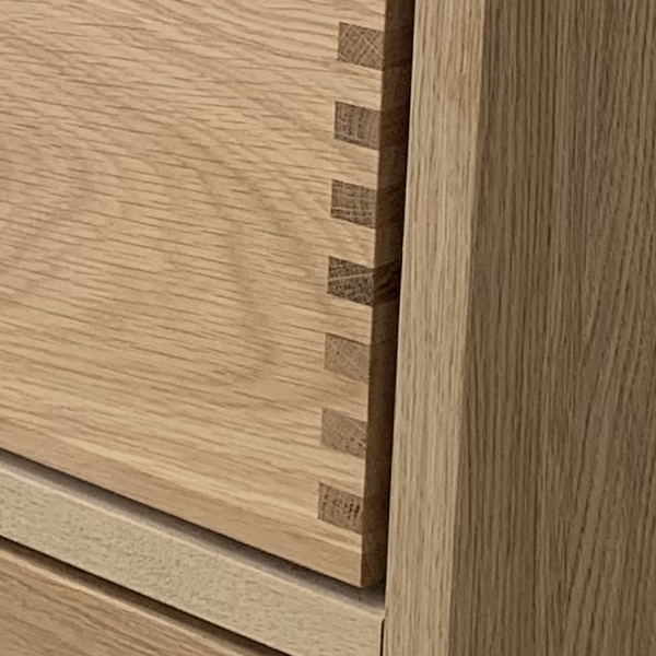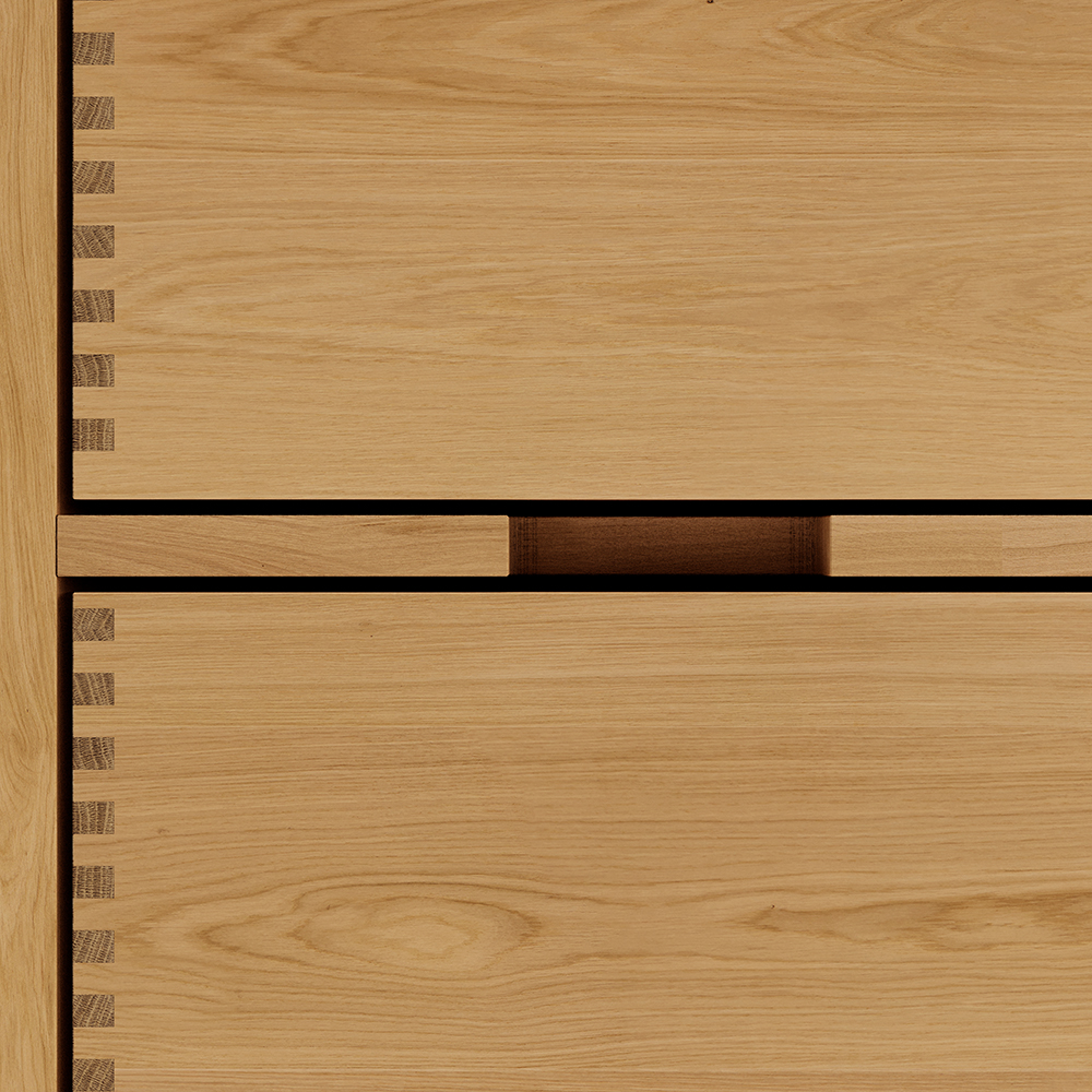 Eines der Merkmale unserer Schubladen sind unsere massiven, geölten Fingerklemmverbindungen, die in unserem Werk in Dänemark von Hand zusammengebaut werden. Sie sorgen für ein schönes und ästhetisches Aussehen, das Sie zu Hause stolz zur Schau stellen können.