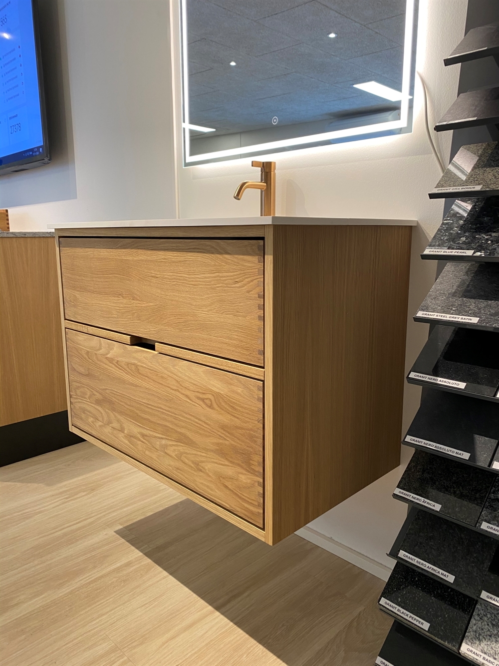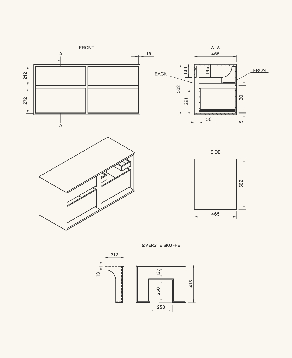 Der Schrank ist aus 19 mm gefertigt. Dicke mit furnierter Eichenvorderkante. Holzschubladen sind 13 mm stark. Seiten mit fingergeklopften Verbindungen und teilweise in Dänemark hergestellt. Wirklich hochwertige dänische Qualität, die zu Preisen verkauft wird, die weit unter dem Marktpreis liegen. Gleichzeitig haben wir im Vergleich zu unseren Mitbewerbern eine extrem kurze Lieferzeit.