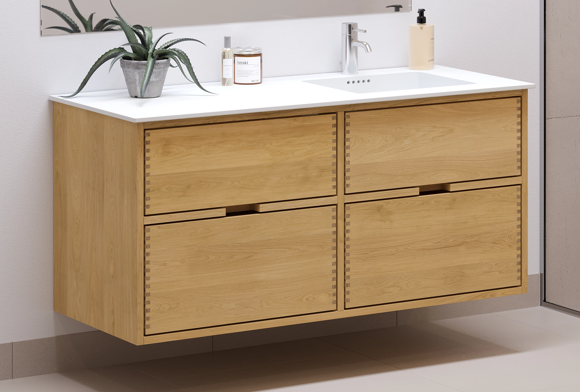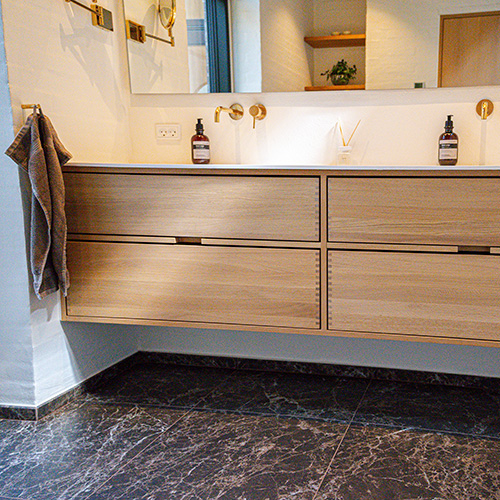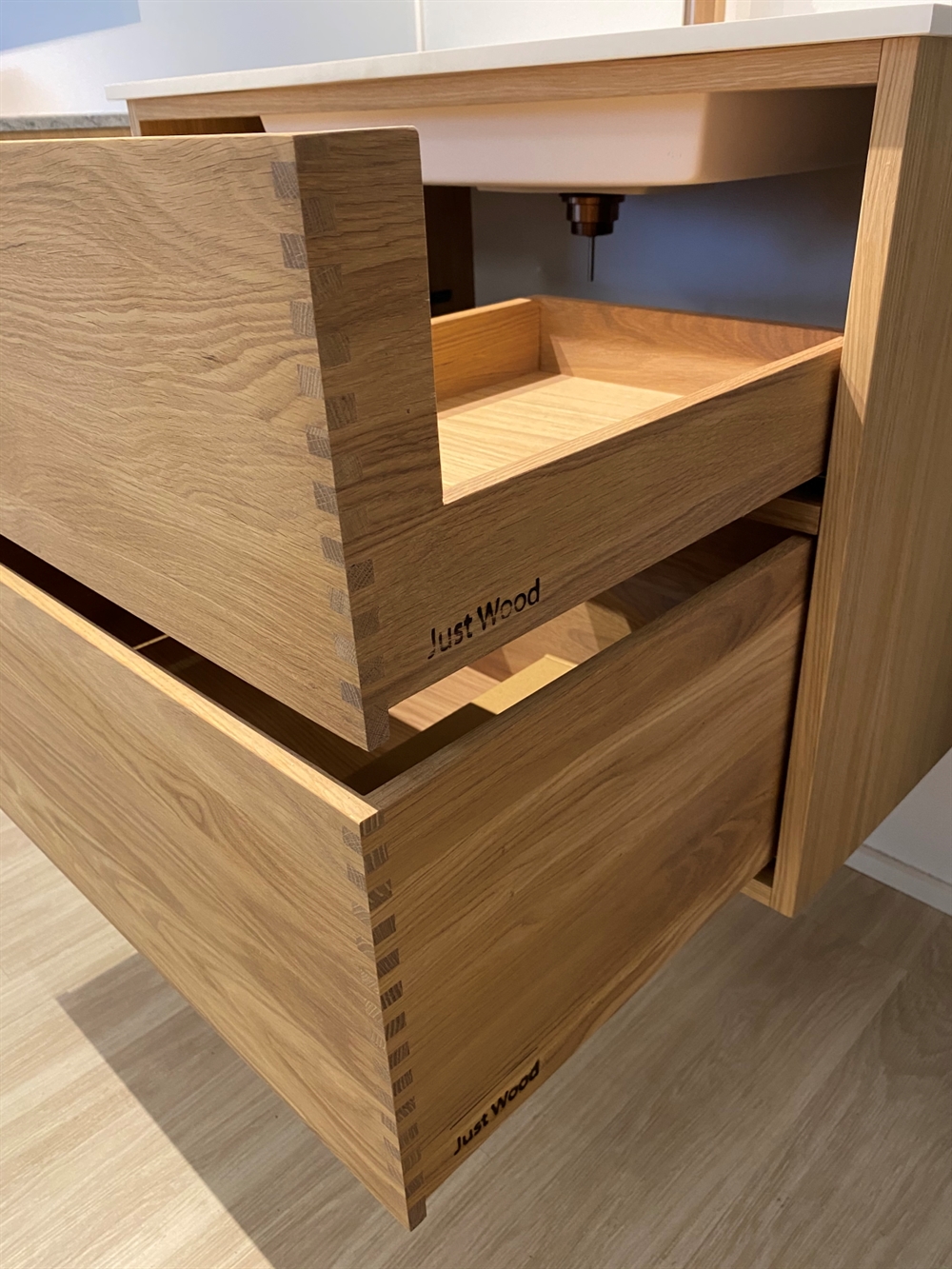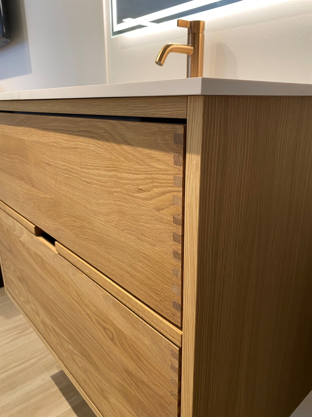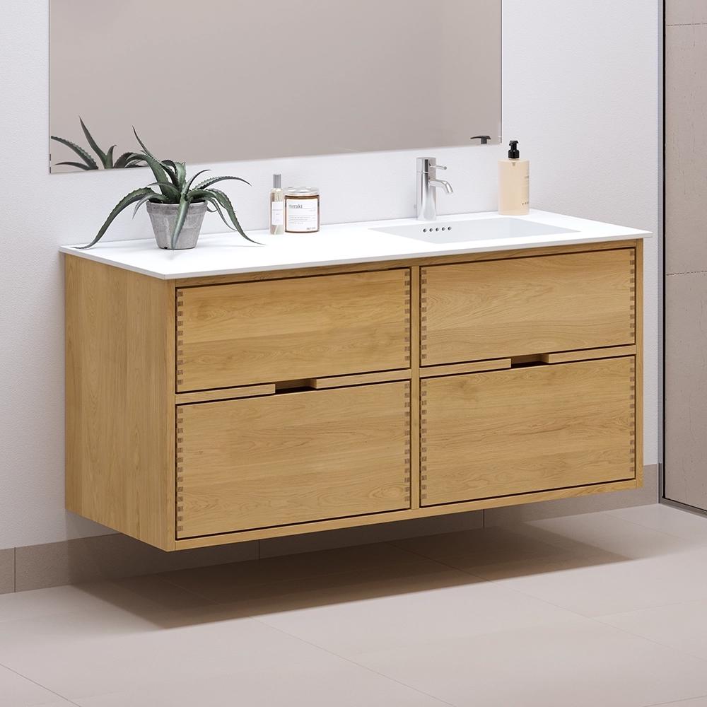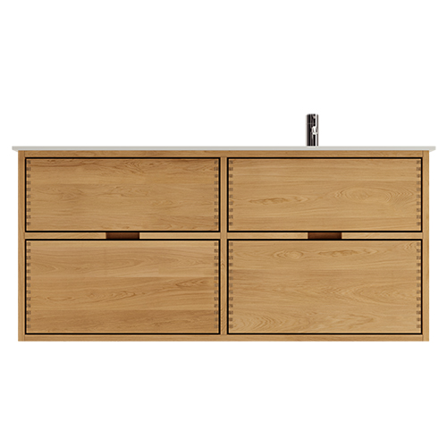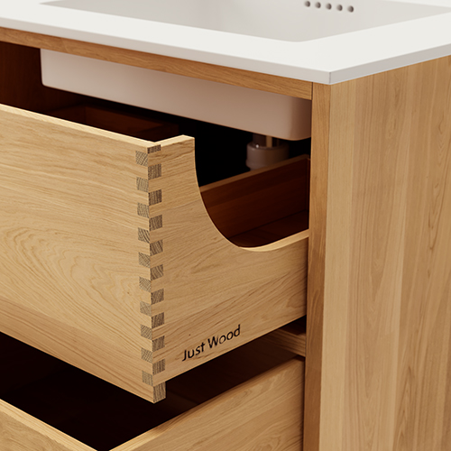 Dieses Badezimmermöbel verfügt über 4 Schubladen. Die Badezimmermöbel bestehen aus massiven, geölten Eichenschubladen mit Fingerzapfenverbindungen mit schönen Details. Die Schubladen sind mit Vollauszug und Soft-Close-Funktion ausgestattet und verfügen über einen Waschbeckenausschnitt in der oberen Schublade und volle Tiefe in der unteren Schublade.