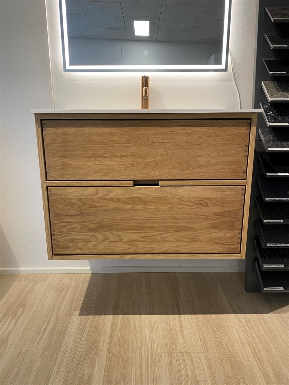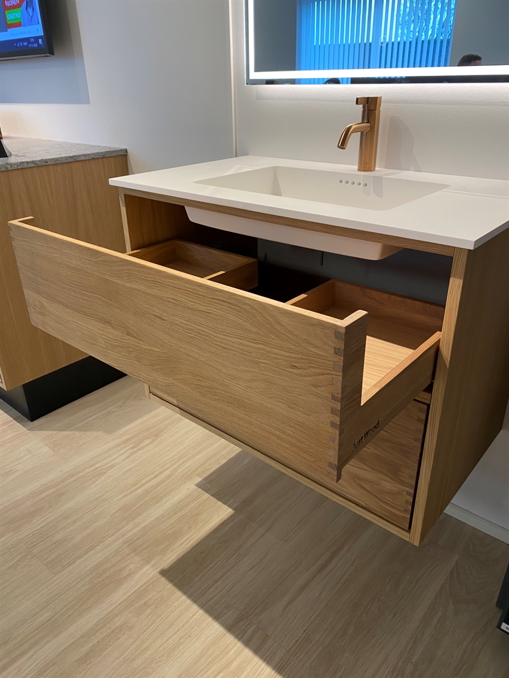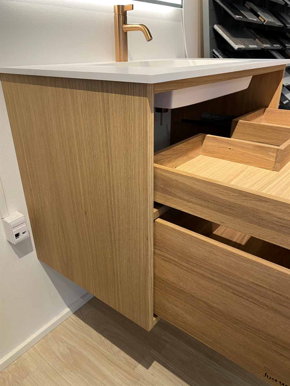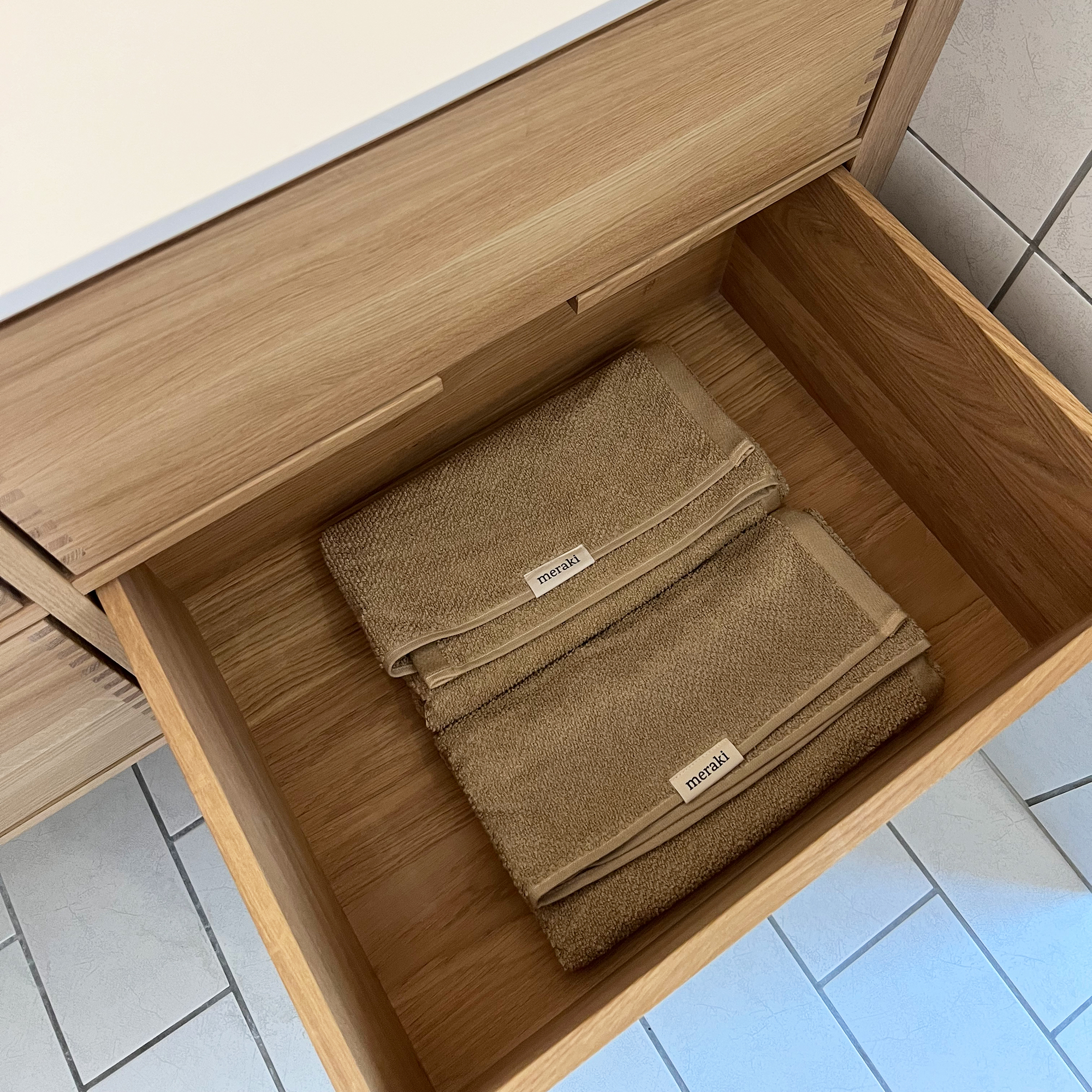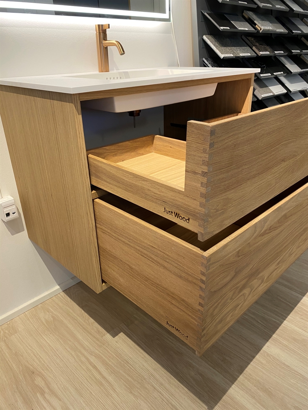 Dieses Badezimmermöbel verfügt über 4 Schubladen. Die Badezimmermöbel bestehen aus massiven, geölten Eichenschubladen mit Fingerzapfenverbindungen mit schönen Details. Die Schubladen sind mit Vollauszug und Soft-Close-Funktion ausgestattet und verfügen über einen Waschbeckenausschnitt in der oberen Schublade und volle Tiefe in der unteren Schublade.