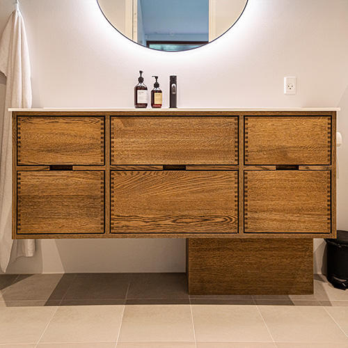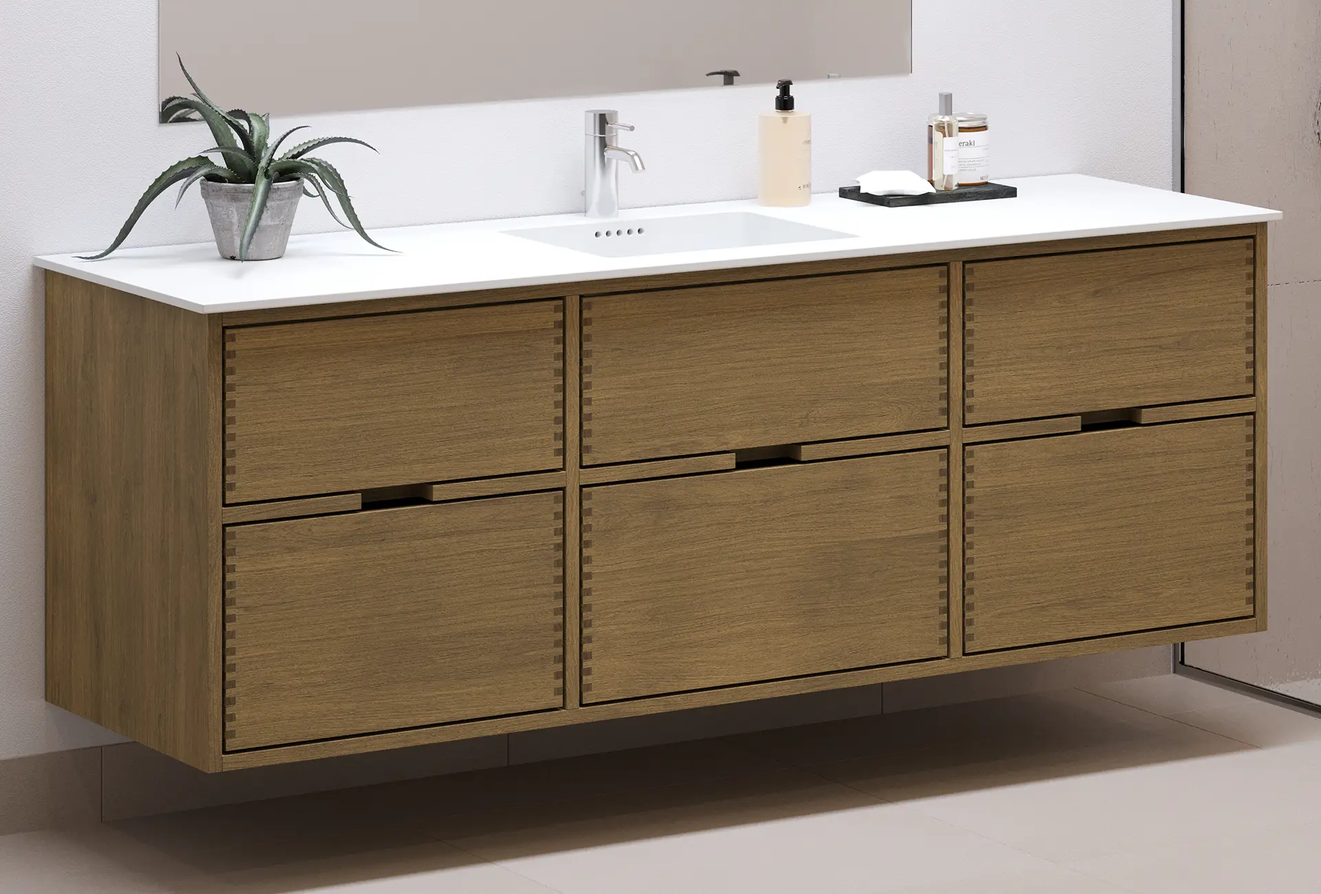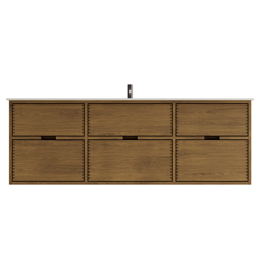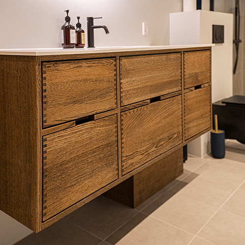 Dieses Badezimmermöbel verfügt über 6 Schubladen. Die Badezimmermöbel bestehen aus massiven, geölten Eichenschubladen mit Fingerzapfenverbindungen mit schönen Details. Die Schubladen sind mit Vollauszug und Soft-Close-Funktion ausgestattet und verfügen über einen Waschbeckenausschnitt in der oberen Schublade und volle Tiefe in der unteren Schublade.