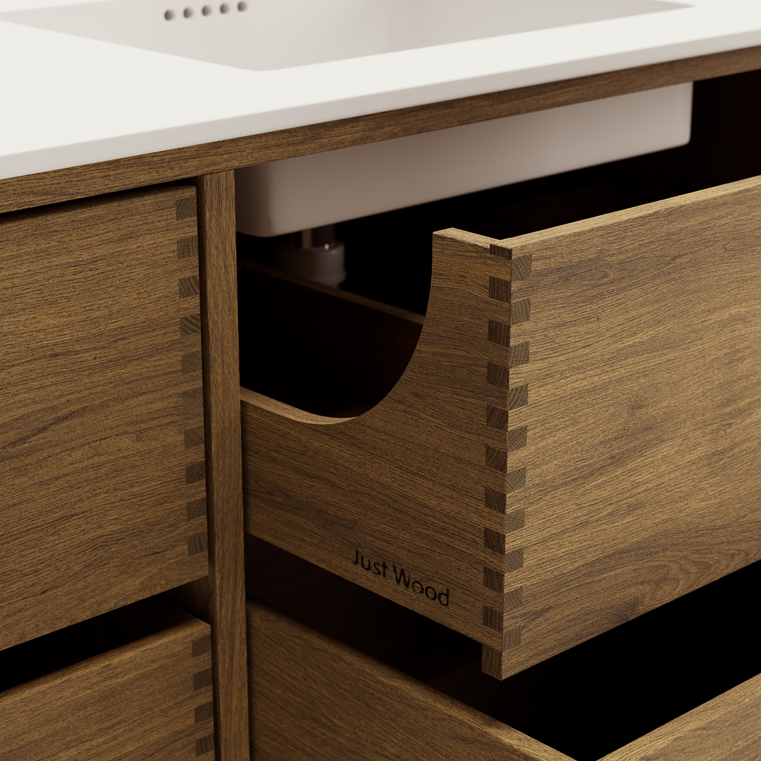 Die Holzschubladen sind aus starkem 13 mm Material gefertigt. Seiten, an denen die oberste Schublade blockiert und befestigt ist, so dass dahinter Platz für das Waschbecken bleibt. Die mittlere Schublade ist mit einem Spülbeckenausschnitt ausgestattet, so dass Platz für den Ablauf des Spülbeckens bleibt. Die untere Schublade ist besonders tief, sodass Sie den Platz optimal nutzen können.