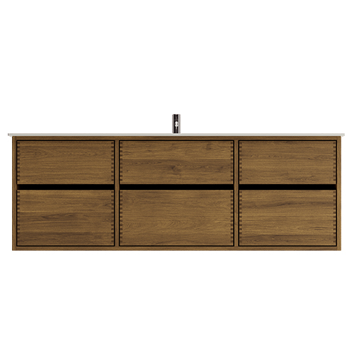 Bei dieser Serie sind die Badmöbel aus dunkel geöltem Holz gefertigt, ohne Zwischenzapfen und mit Luft zwischen den Schubladen.