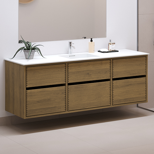 Dieses Badezimmermöbel verfügt über 6 Schubladen. Die Badezimmermöbel bestehen aus massiven, geölten Eichenschubladen mit Fingerzapfenverbindungen mit schönen Details. Die Schubladen sind mit Vollauszug und Soft-Close-Funktion ausgestattet und verfügen über einen Waschbeckenausschnitt in der oberen Schublade und volle Tiefe in der unteren Schublade.