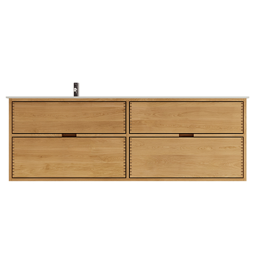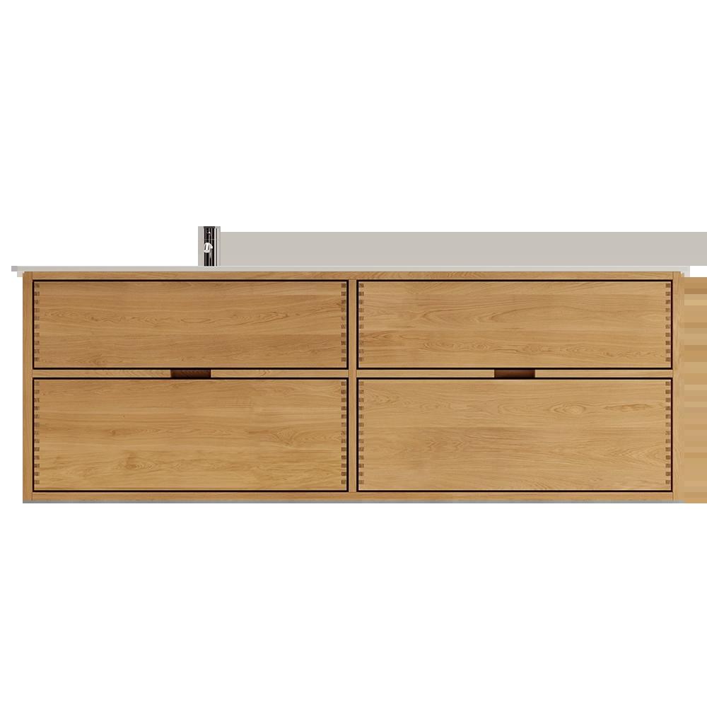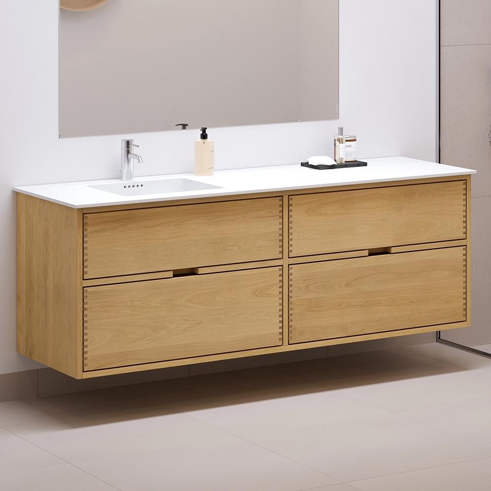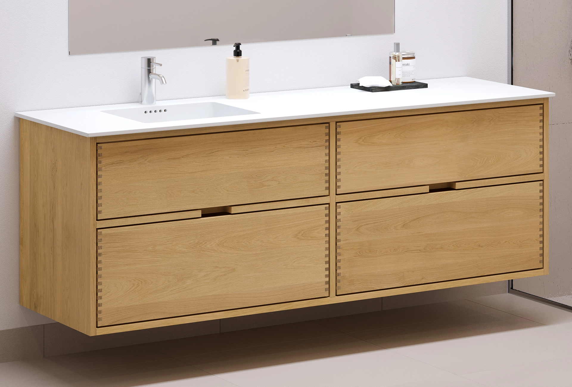 Dieses Badezimmermöbel verfügt über 4 Schubladen. Die Badezimmermöbel bestehen aus massiven, geölten Eichenschubladen mit Fingerzapfenverbindungen mit schönen Details. Die Schubladen sind mit Vollauszug und Soft-Close-Funktion ausgestattet und verfügen über einen Waschbeckenausschnitt in der oberen Schublade und volle Tiefe in der unteren Schublade.