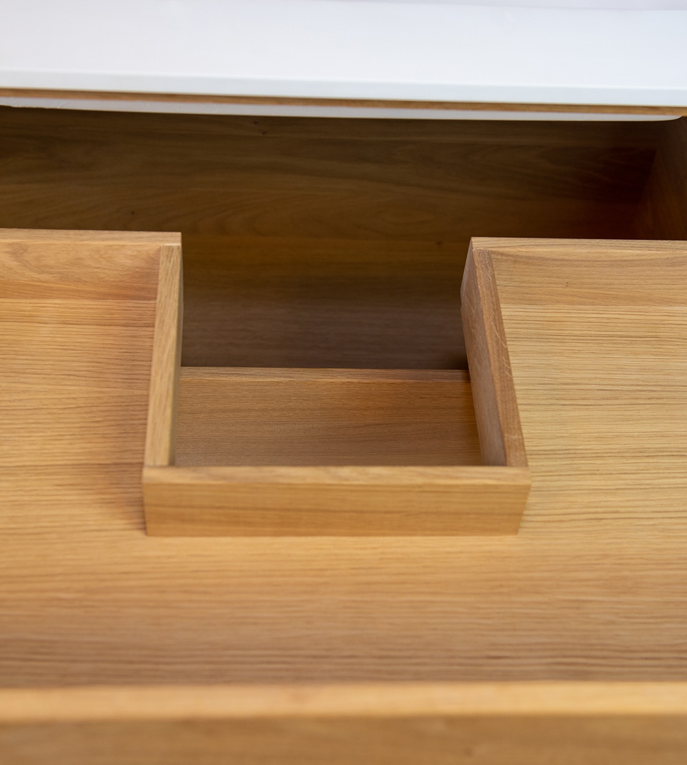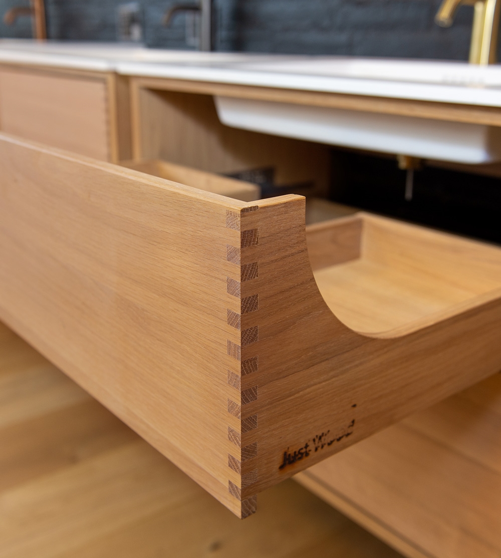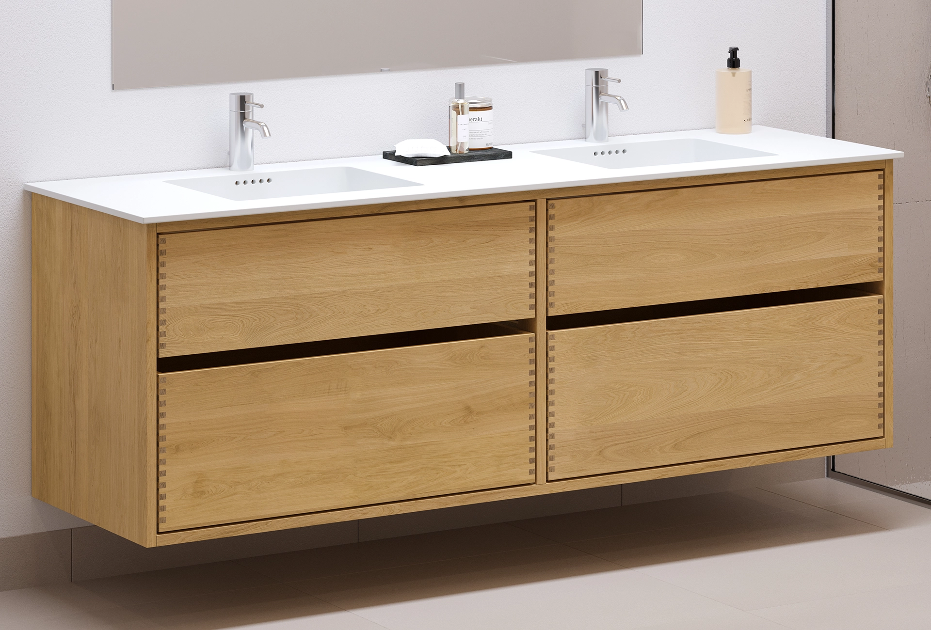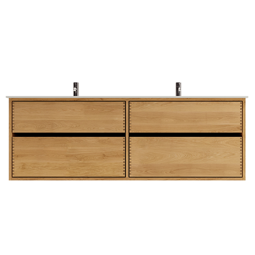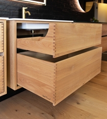 Dieses Schreiner-Badezimmermöbel hat 4 Schubladen und eine Doppelwaschbecken. Das Möbelstück ist aus massivem, geöltem und fingergezapftem Eichenholz mit schönen Details gefertigt. Die Schubladen sind mit Vollauszug und Soft-Close ausgestattet und verfügen über einen Waschbecken-Ausschnitt in der obersten Schublade und volle Tiefe in der untersten Schublade.