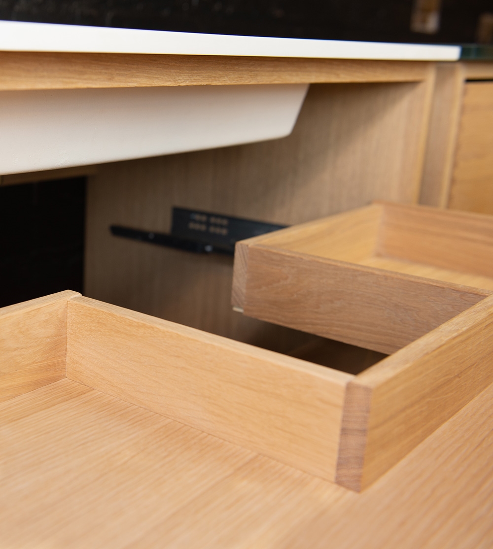 Die Schubladen sind mit Soft-Closing und Auszügen auf den besten Schienen auf dem Markt ausgestattet.