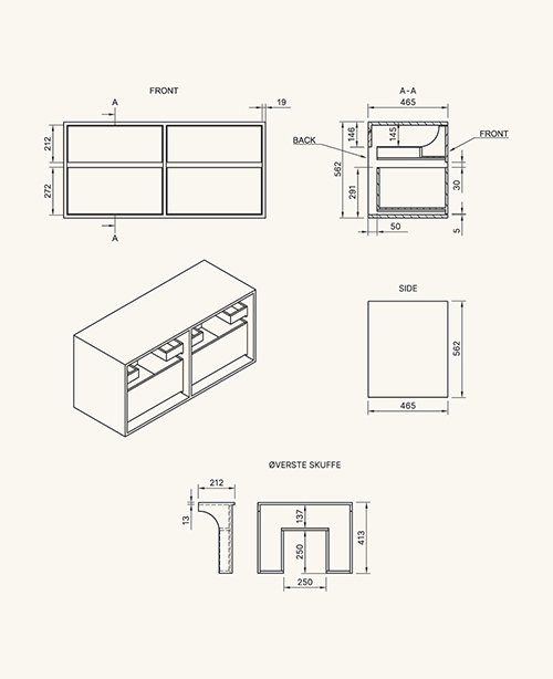Der Korpus ist aus 19 mm dickem Holz mit Eichenfurnierkante gefertigt. Die Holzschubladen sind robuste 13 mm Seiten mit fingergezinkten Verbindungen und teilweise in Dänemark hergestellt. Wirklich hohe dänische Qualität, die zu Preisen verkauft wird, die weit unter dem Marktpreis liegen. Gleichzeitig haben wir extrem kurze Lieferzeiten im Vergleich zu unseren Mitbewerbern.